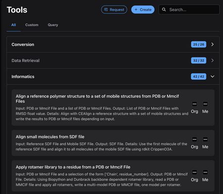 The Tools sections display all of the tools currently available in MARA. You can sort by All or Custom tools, or you can query the list to see if a tool is available.