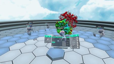 In order to scale the environment or molecular structures, press down on the middle finger 'grip' button on each controller. Next, bring the controllers together to scale the environment smaller or pull them apart to scale the environment larger.
