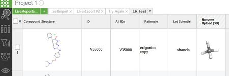 If the LiveReport already contains the uploaded ligand, it will add poses to this ligand in the "Nanome Upload" column. If not, a new row will be created and poses will be added to it in the "Nanome Upload" column.