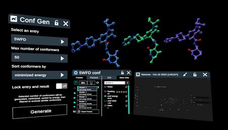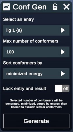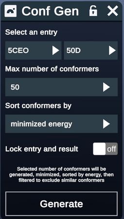 The Conformer Generator Plugin uses RDKit and UFF minimization to deliver a collection of diverse, low energy conformers of a selected “seed” ligand. 3D results are captured as frames in a single new entry in the workspace. The associated minimized energy and similarity to the seed ligand (RMSD) for the seed and all conformers is accessible in both the Advanced Menu - Frames and via the Data Table Plugin.