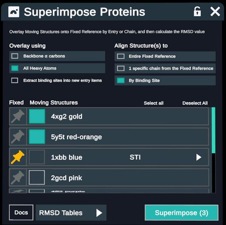 By default, the first entry is set as Fixed, and designated by the yellow pin. When selected as Fixed, the box under Moving will be inactive. To change this selection, select the pin next to the desired Fixed Reference protein.