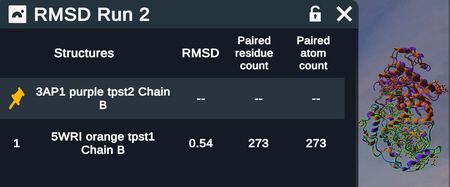 Once complete, the proteins will be superimposed and locked, for visual inspection. The RMSD tables pulldown menu in the lower left will become active. Each superimpose run will generate a new table, with the most recent run appearing at the top of the pulldown list. Select the run to open the table in the workspace. Tables can be closed and reopened in the workspace.