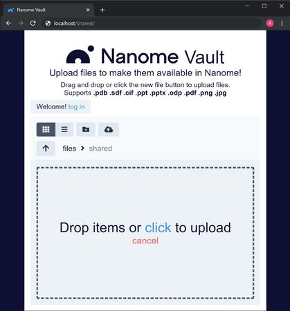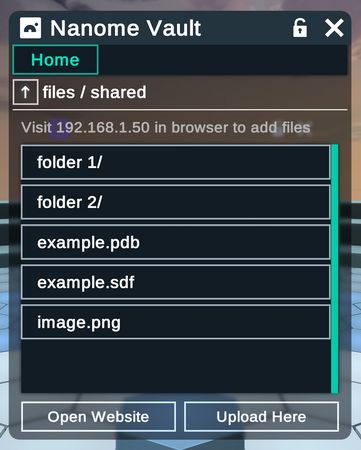 Nanome Vault is a plugin that enables easy cloud upload, download and storage from VR headsets and your web browser. This allows users to drag and drop a file to/from their web browser and make it instantly available in their Nanome session.