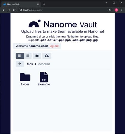 With the rise of all-in-one headsets like the Oculus Quest 2 and the Vive Focus 3, the barrier to entry to store and retrieve files has increased considerably due to the need to plug the headset into a computer and use Android File transfer manually. Nanome Vault allows users to open up a web browser on any computer to access cloud storage that is integrated directly into their Nanome session and linked to your Nanome account. You can visit the Nanome-hosted Vault Plugin at https://vault.nanome.ai. Note that if you are an Enterprise customer, your Organization will have a different web address for the private-cloud deployment of the Nanome Vault, please contact your Nanome administrator for the correct URL.
